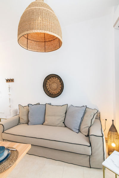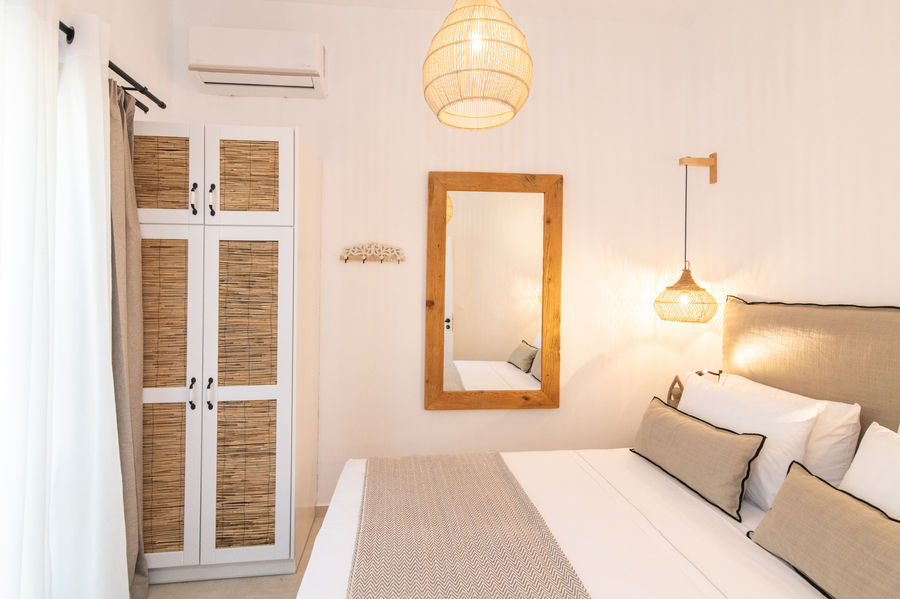 This cozy apartment in Tinos town offers a serene retreat in a central but quiet location near Tino's central plaza but without the commotion. The interior features a beautifully decorated bedroom with natural textures, a charming balcony with intricate floor tiles and seating, and a fully-equipped kitchenette with a rustic dining area. Ideal for those seeking a peaceful yet convenient stay, the apartment blends comfort and style seamlessly.